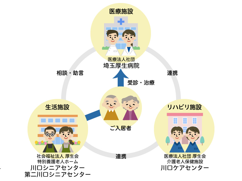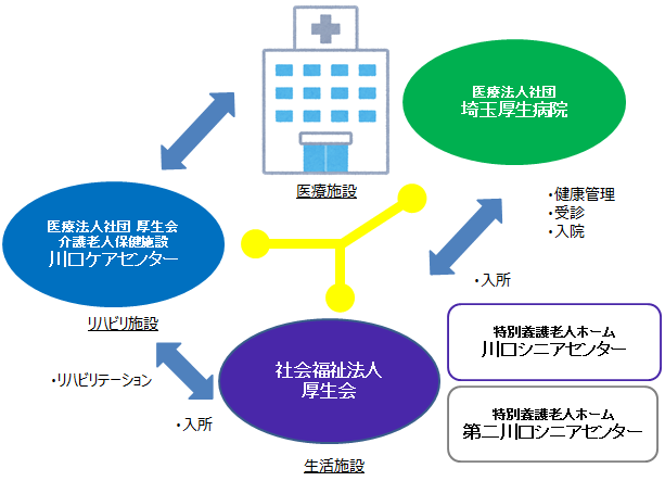 法人母体である医療法人社団厚生会との連携の強さを最大限に活用し、「暮らしの場」の特別養護老人ホームに必要とされる医療サポートを提供する未来型の施設をめざしてまいります。